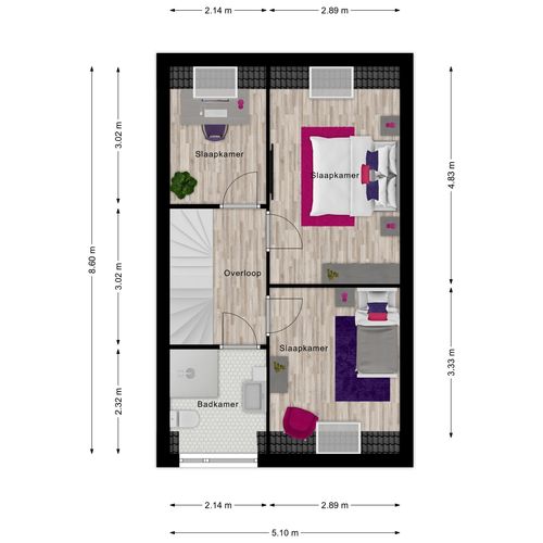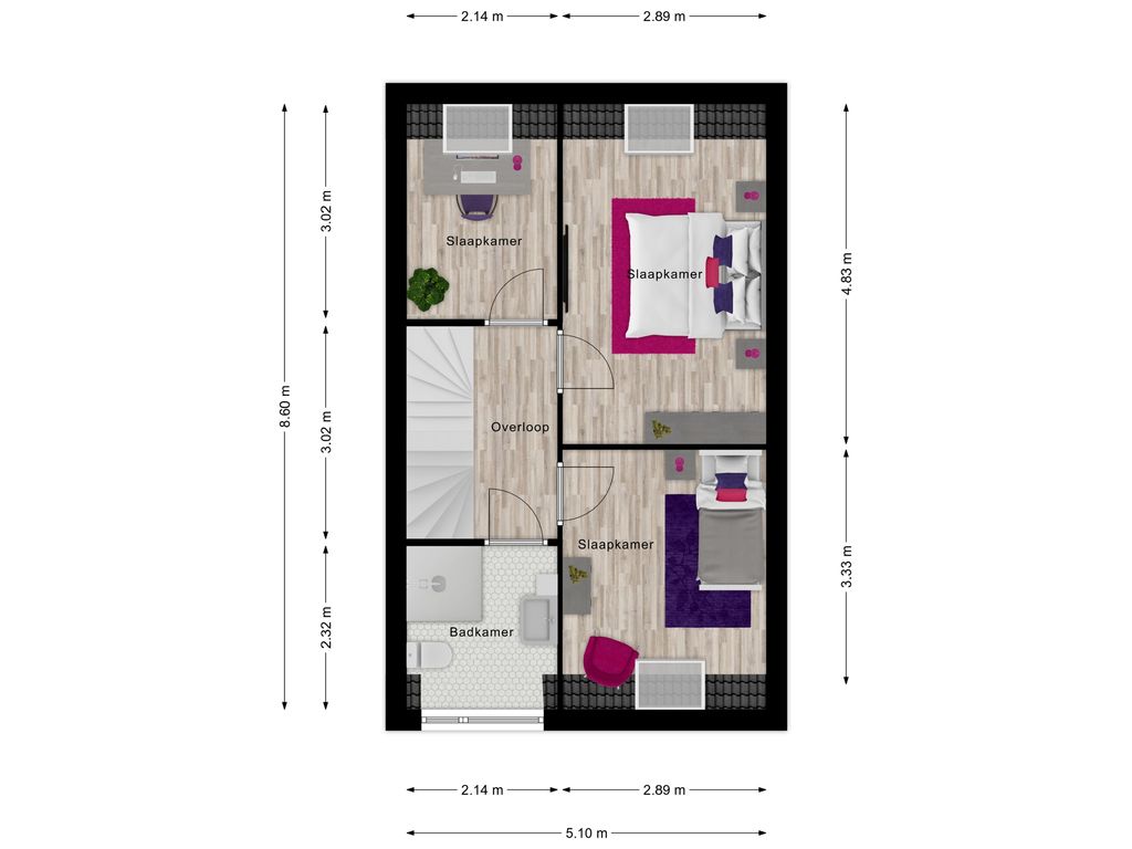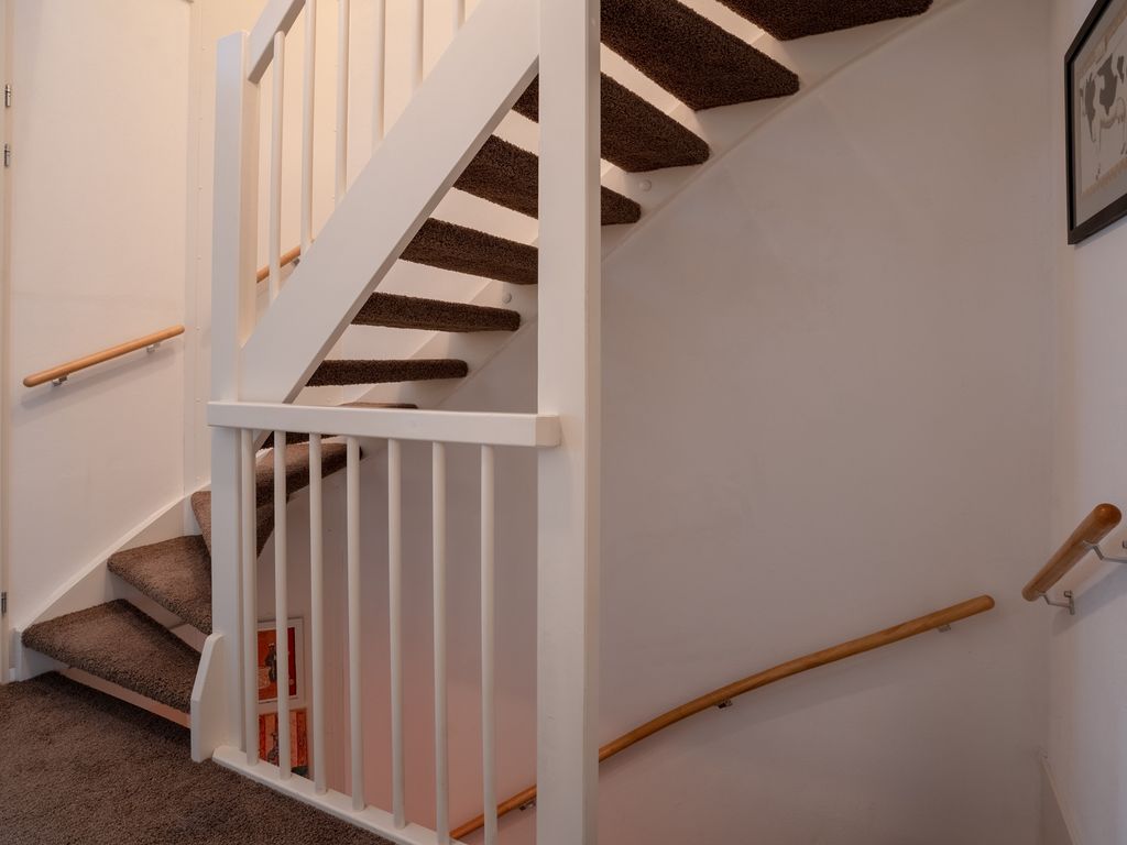 Overloop met toegang tot drie slaapkamers. De badkamer is compleet ingericht met een douche, vrijhangend toilet en wastafelmeubel.