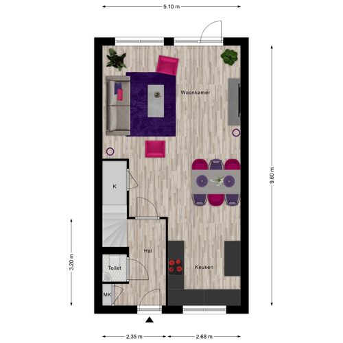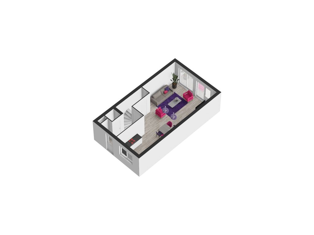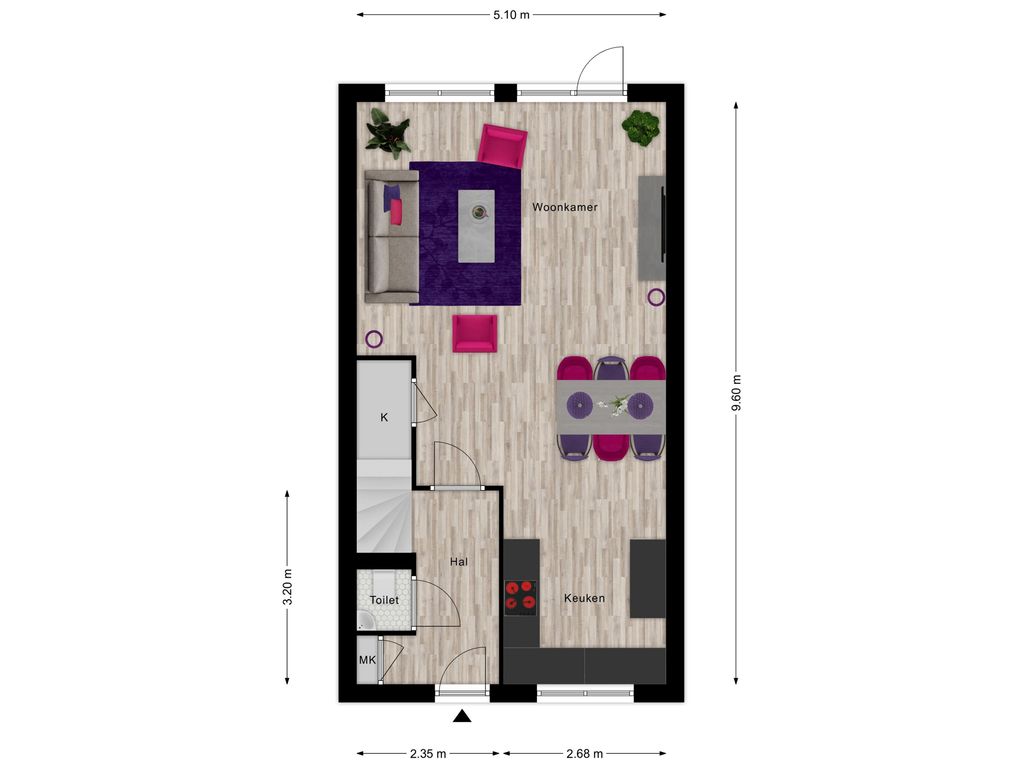 Entree met meterkast (3-fasen-aansluiting), modern vrijhangend toilet en trapopgang naar de eerste verdieping. De lichte woonkamer beschikt over een handige trapkast en staat in open verbinding met de moderne keuken aan de voorzijde. De keuken is voorzien van een inductiekookplaat, afzuigkap, vaatwasser, oven en koelkast – alles wat je nodig hebt om direct aan de slag te kunnen.
