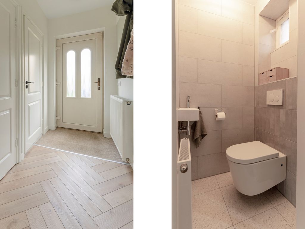 hal met toilet en vaste kast met aansluiting van de was apparatuur. Toegang tot de woonkamer, eethoek en de fraaie keuken. De voorzijde van de woonkamer is voorzien van een erker en de achterzijde van een harmonicadeur naar het terras. Vanuit de keuken is er tevens toegang tot de tuin.