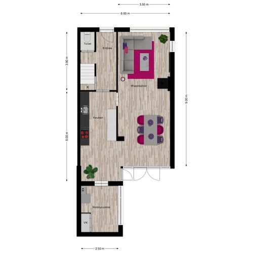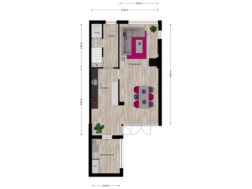 hal met toilet en kelderkast voor de provisie, speels ingedeelde keuken, gezellige zithoek met gashaard en een extra zijraam. Door de uitbouw is er voldoende ruimte voor een grote eethoek. Aan de achterzijde is de extra (speel/werk)kamer aanwezig waar ook de c.v. ketel en de wasapparatuur te vinden zijn.