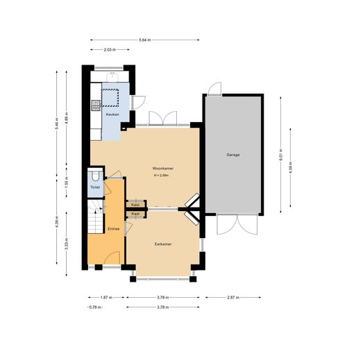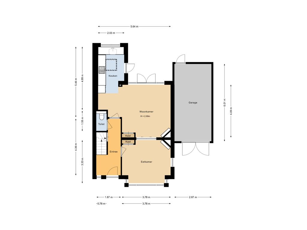 Entree met garderobe, toilet, trapopgang en toegang tot de kelder. De kamer-en-suite biedt een royale leefruimte met dubbele haard en openslaande deuren naar de tuin. De uitgebouwde keuken is licht en modern, voorzien van een lichtkoepel en diverse inbouwapparatuur, waaronder een vaatwasser, koelkast, combimagnetron en 5-pits gaskookplaat.
