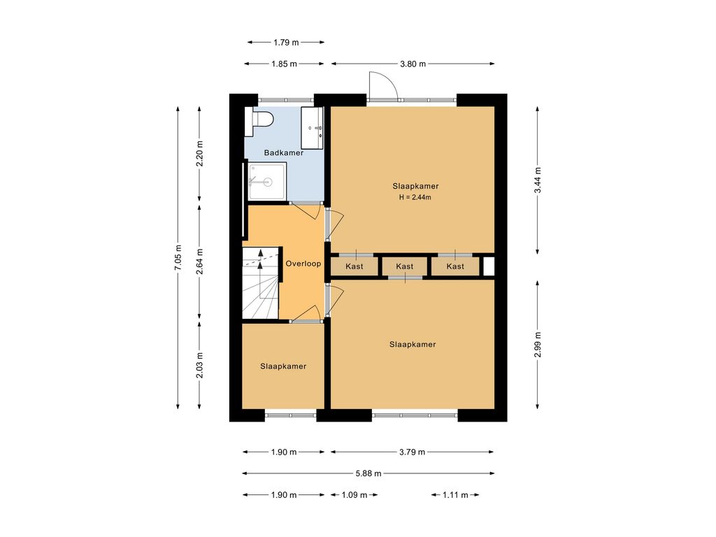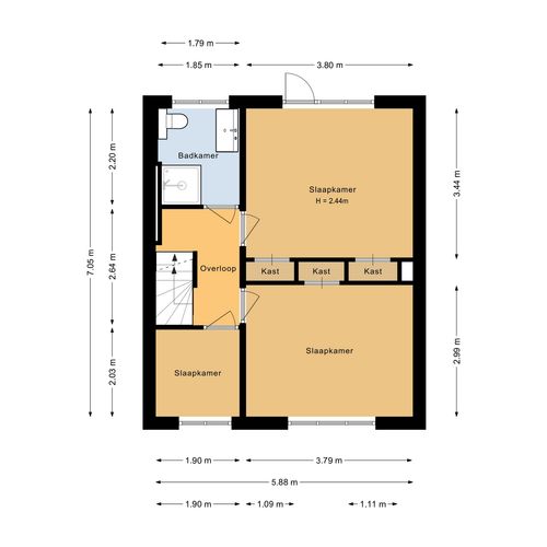 Overloop met toegang tot drie slaapkamers, waarvan twee met inbouwkasten. De badkamer is strak afgewerkt en voorzien van alle gemakken.