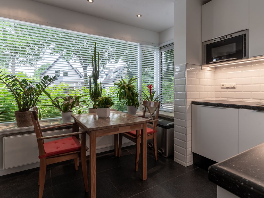 hal met trapopgang en toiletruimte voorzien van hangend toilet en fonteintje. Ruime, uitgebouwde woonkamer met eikenhouten vloer, gashaard en openslaande deuren naar de tuin. Aansluitend de half-open keuken met sfeervolle erker en voorzien van diverse inbouwapparatuur.