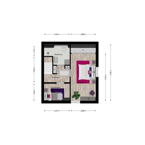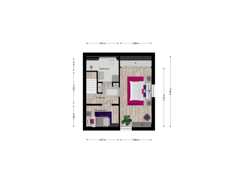 overloop, 2 slaapkamers (de grote slaapkamer is voorzien van veel vaste kastruimte) en een modern ingerichte badkamer voorzien van inloopdouche, wastafelmeubel, 2e toilet en wasmachine aansluiting.