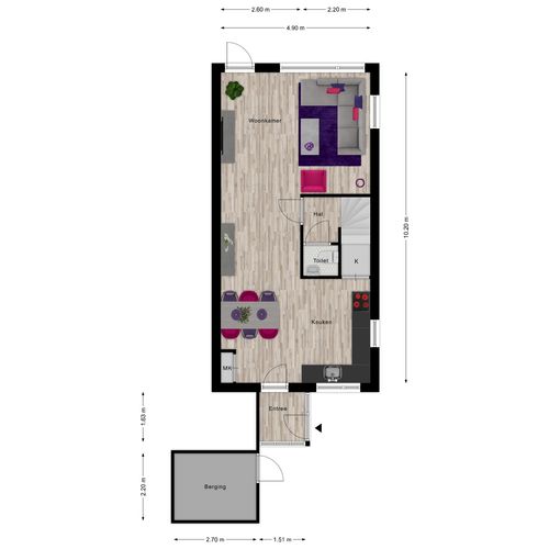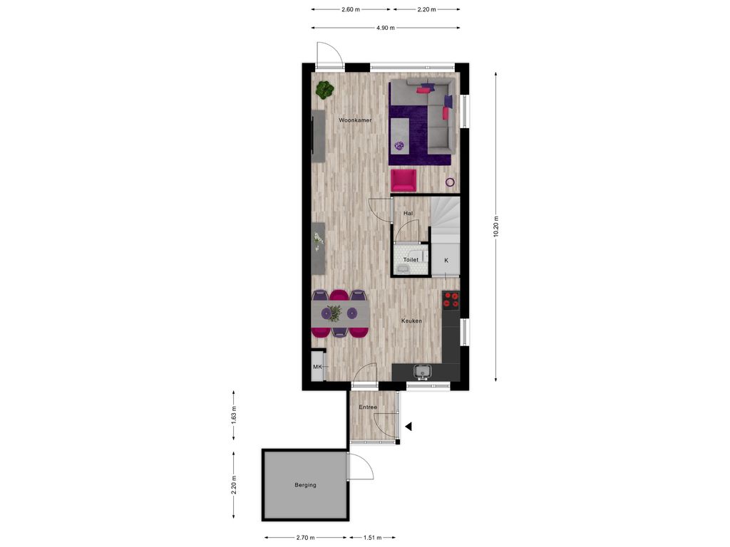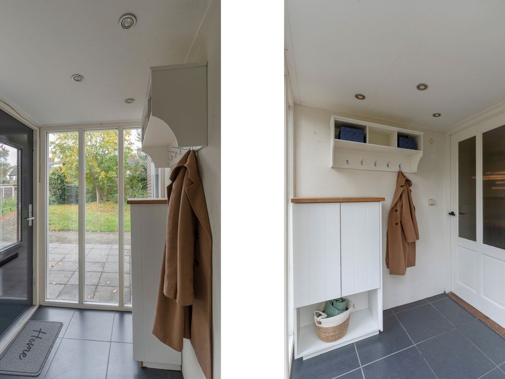 ruime hal, open keuken met trapkast en een L-vormige woonkamer met een extra zijraam en toegang tot de achtertuin. Gang met trap en toilet.
