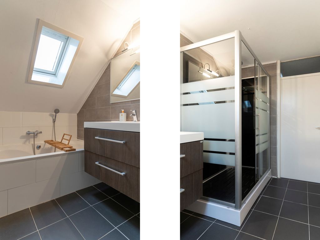 overloop, 3 slaapkamers en een badkamer welke voorzien is van een ruime douchecabine, bubbelbad en wastafelmeubel.