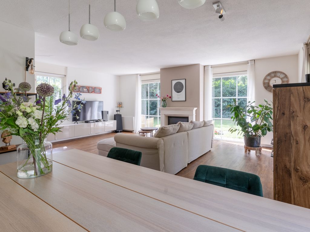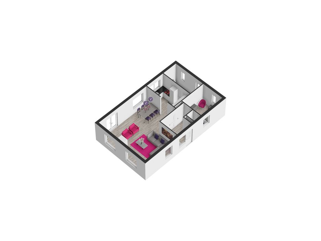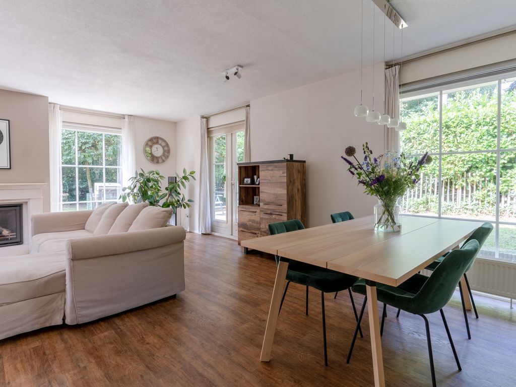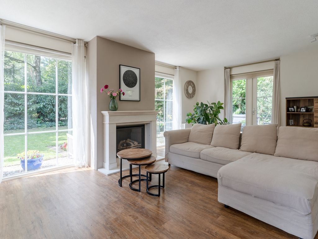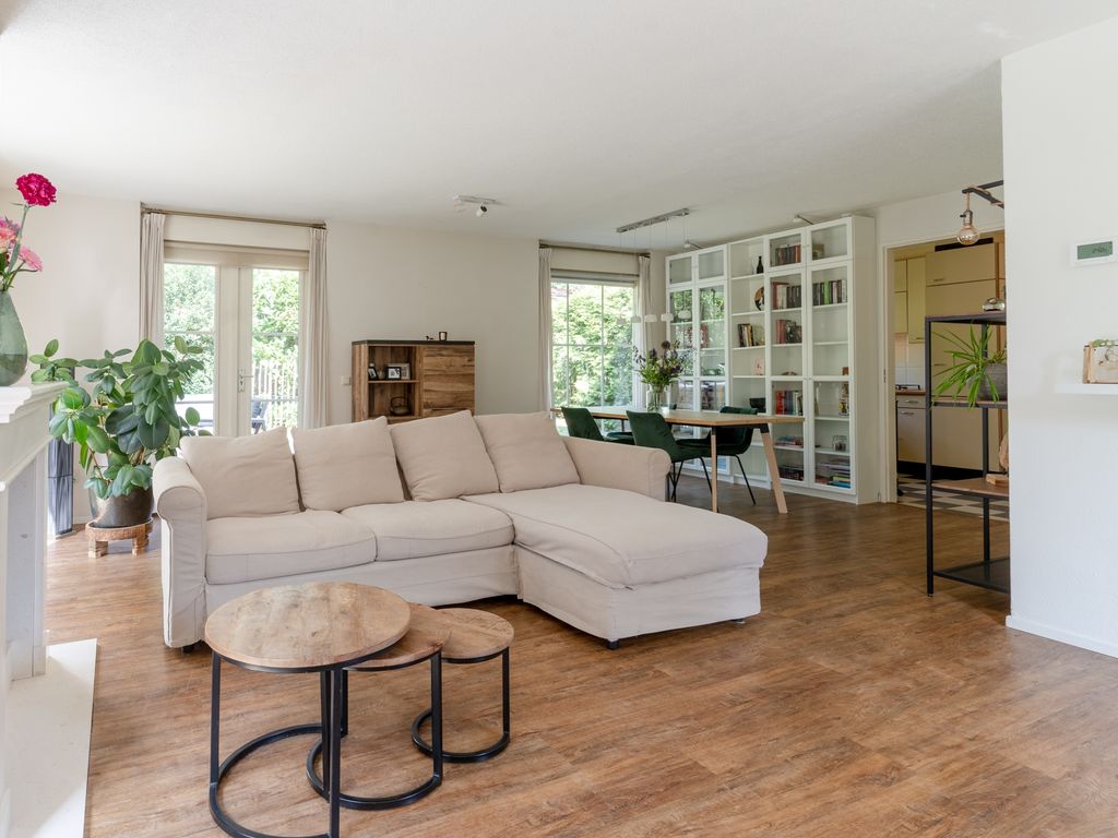 hal met toilet, slaap/werkkamer. L-vormige woonkamer met veel raampartijen en toegang tot de keuken en de bijkeuken.