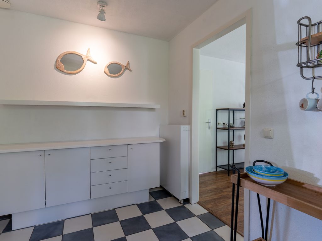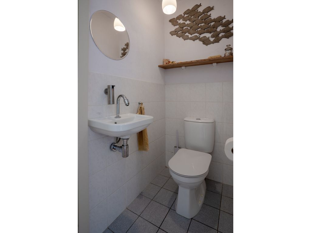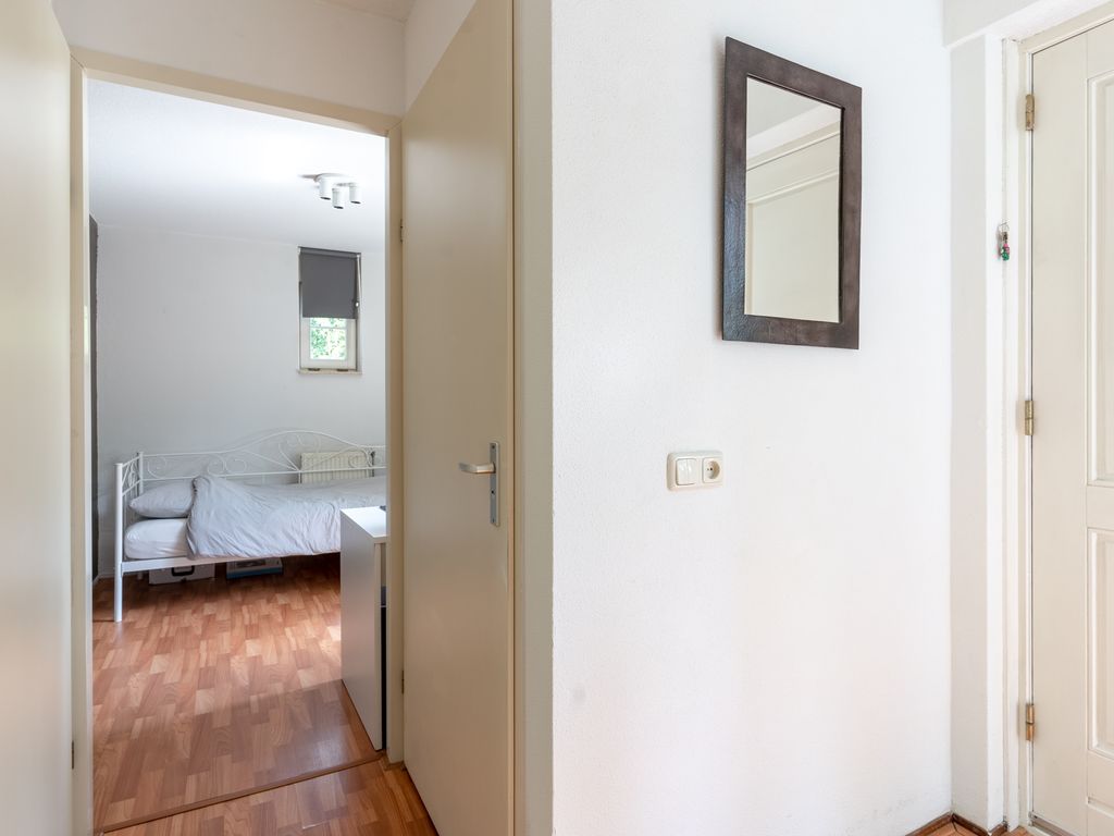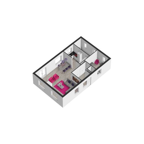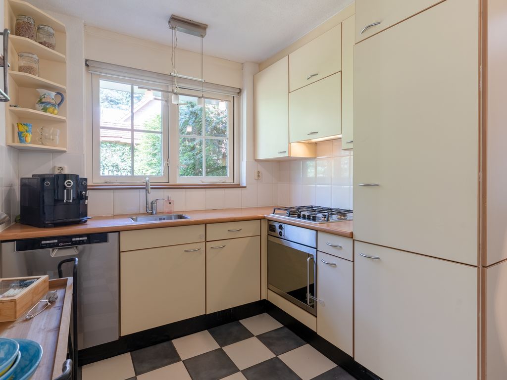 hal met toilet, slaap/werkkamer. L-vormige woonkamer met veel raampartijen en toegang tot de keuken en de bijkeuken.