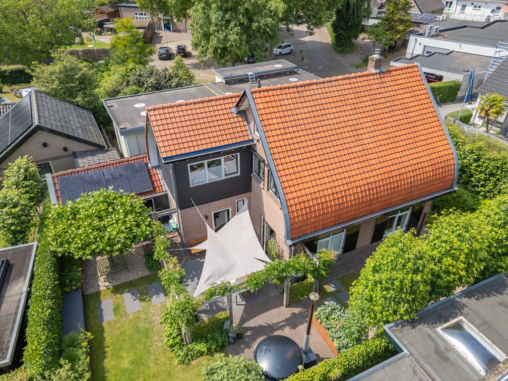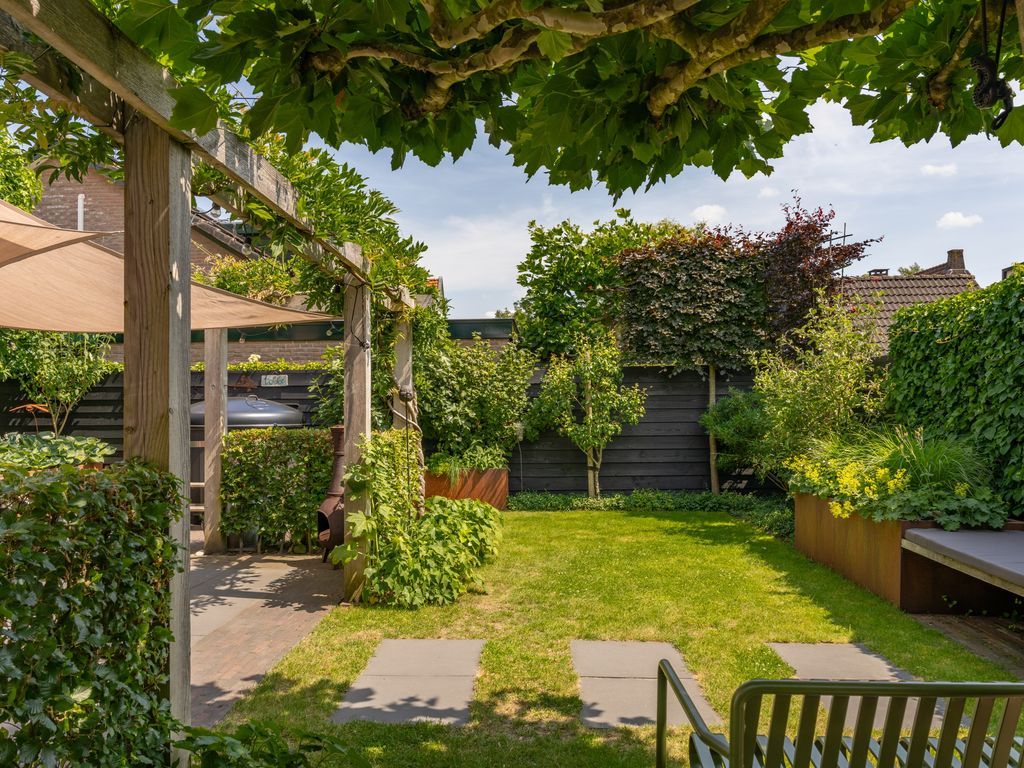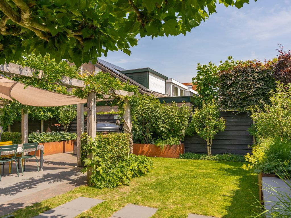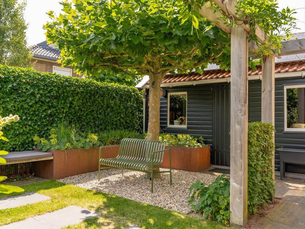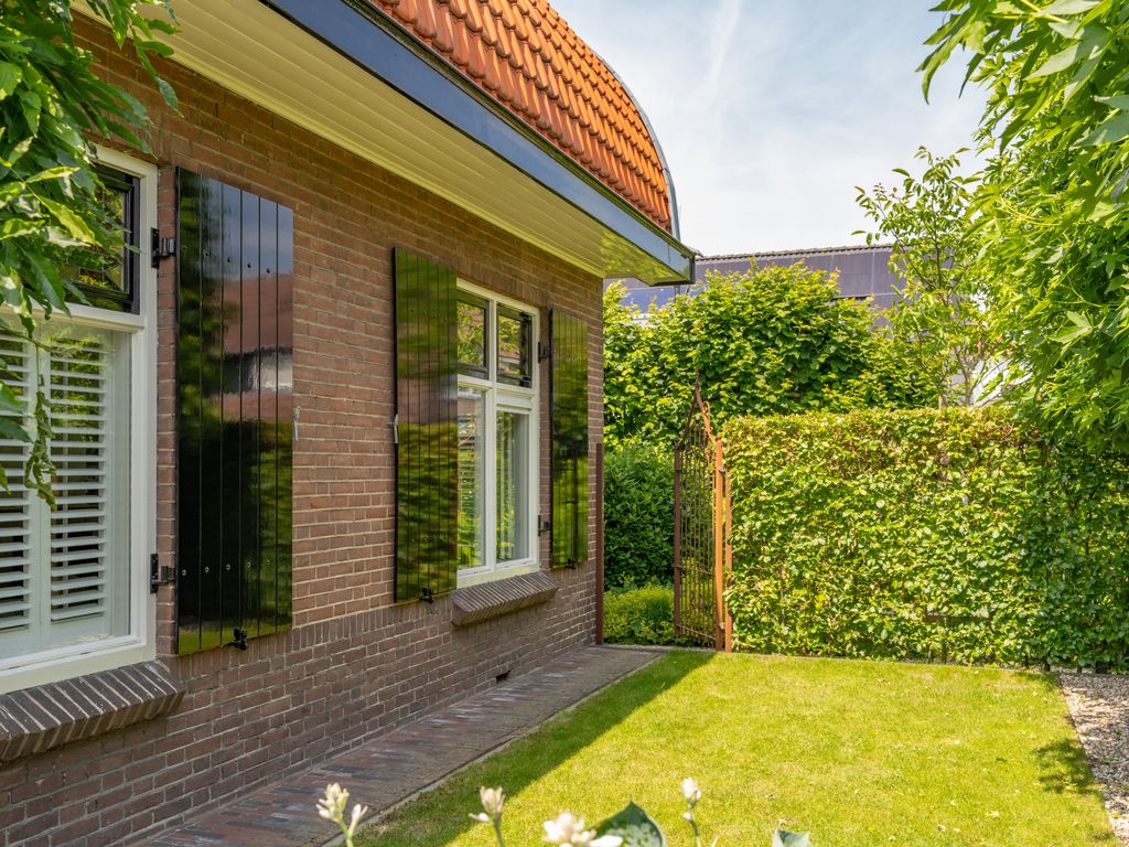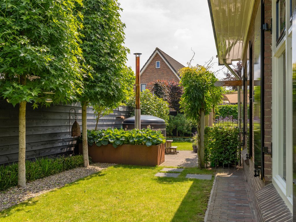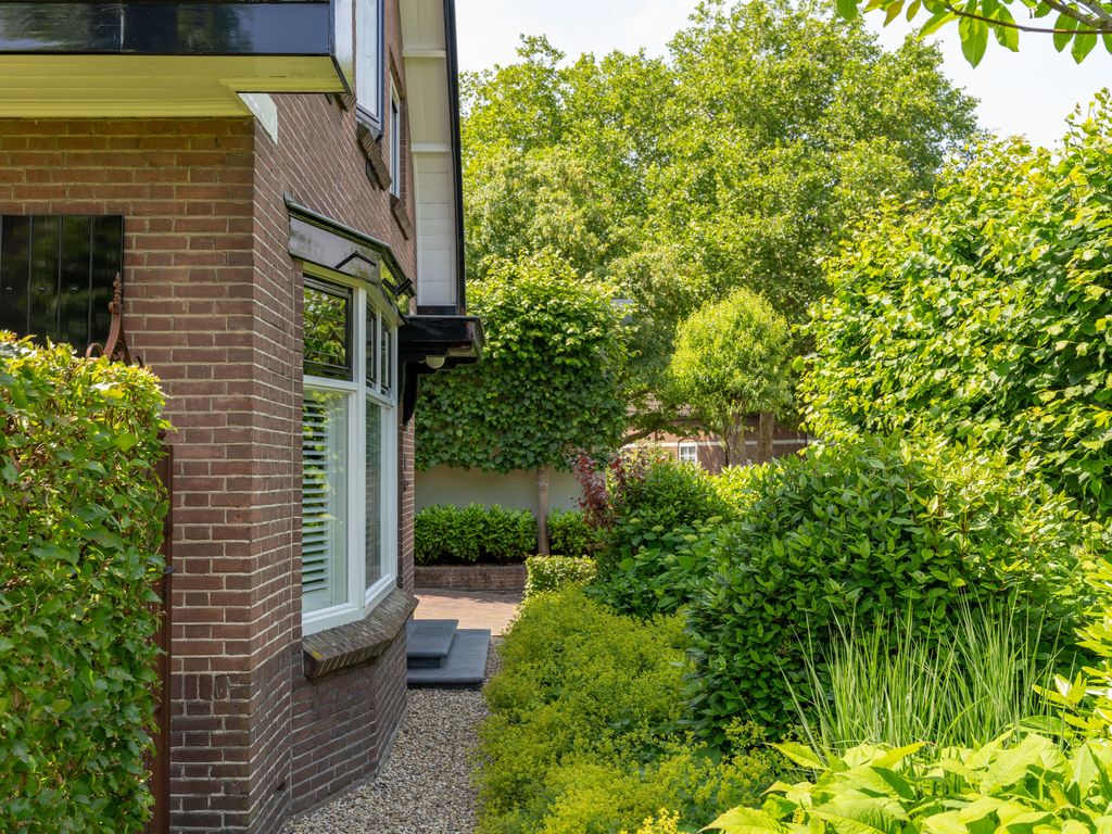 De ruime, onder architectuur aangelegde tuin op het zuiden biedt veel privacy en vormt een oase van rust. Cortenstaal  accenten, sfeervolle verlichting , automatische beregening en een sedum dak op de houtopslag zorgen voor een verzorgde, luxe uitstraling. De voortuin met karakteristiek toegangshek en hardstenen trap maakt het geheel compleet. De ruime oprit biedt plaats aan drie auto’s en op de grote schuur met zolder bevinden zich negen zonnepanelen. Al het houtwerk is recent geschilderd; zinken goten, luiken en regenwateropvangsystemen versterken de duurzame kwaliteit van dit huis.