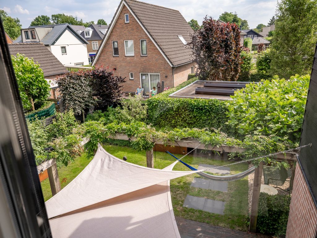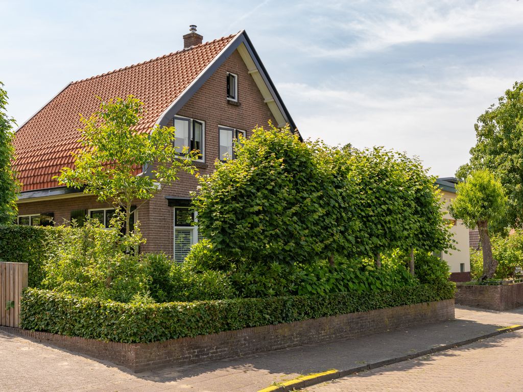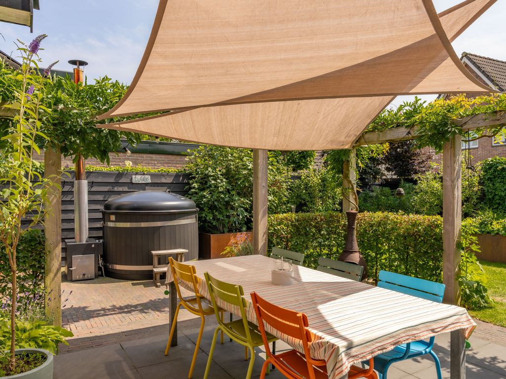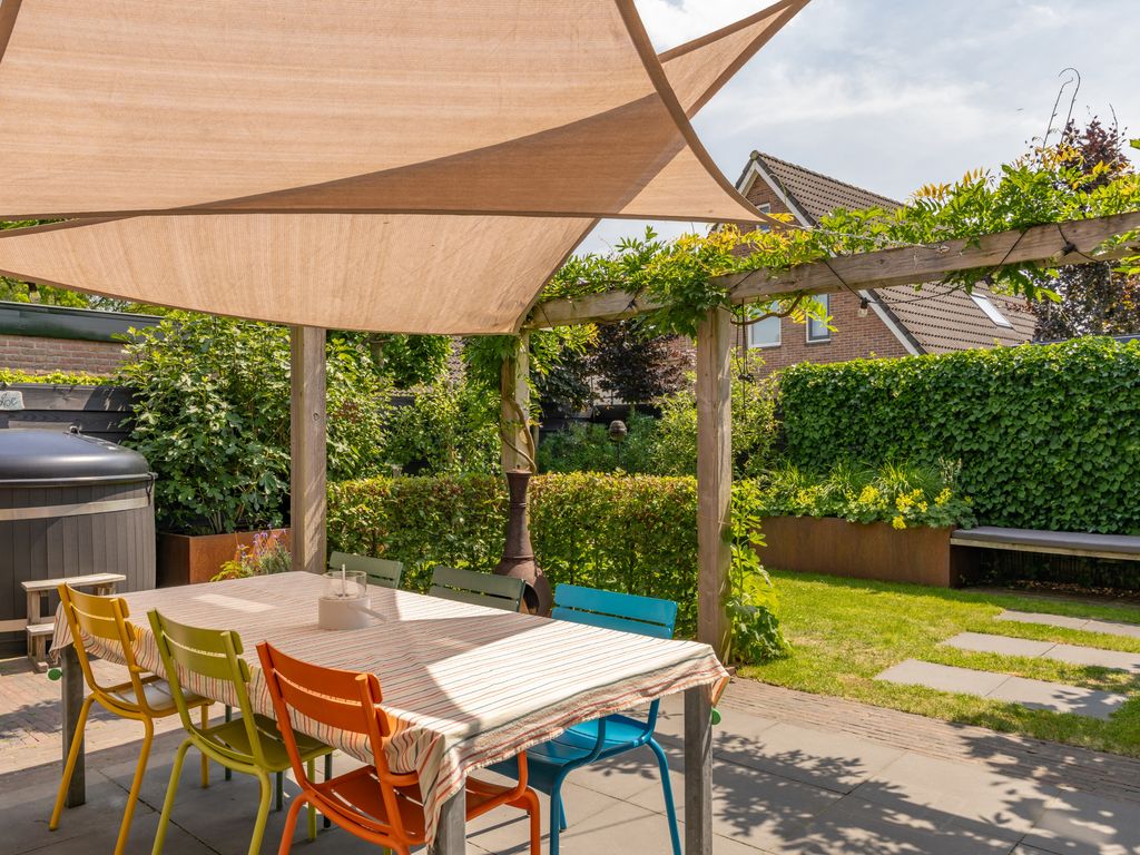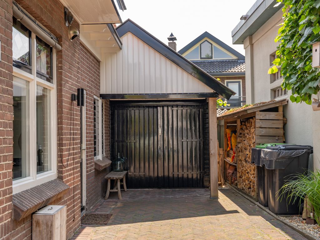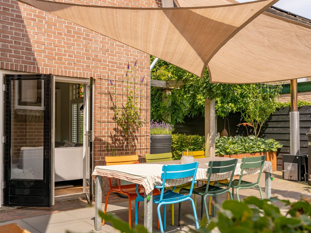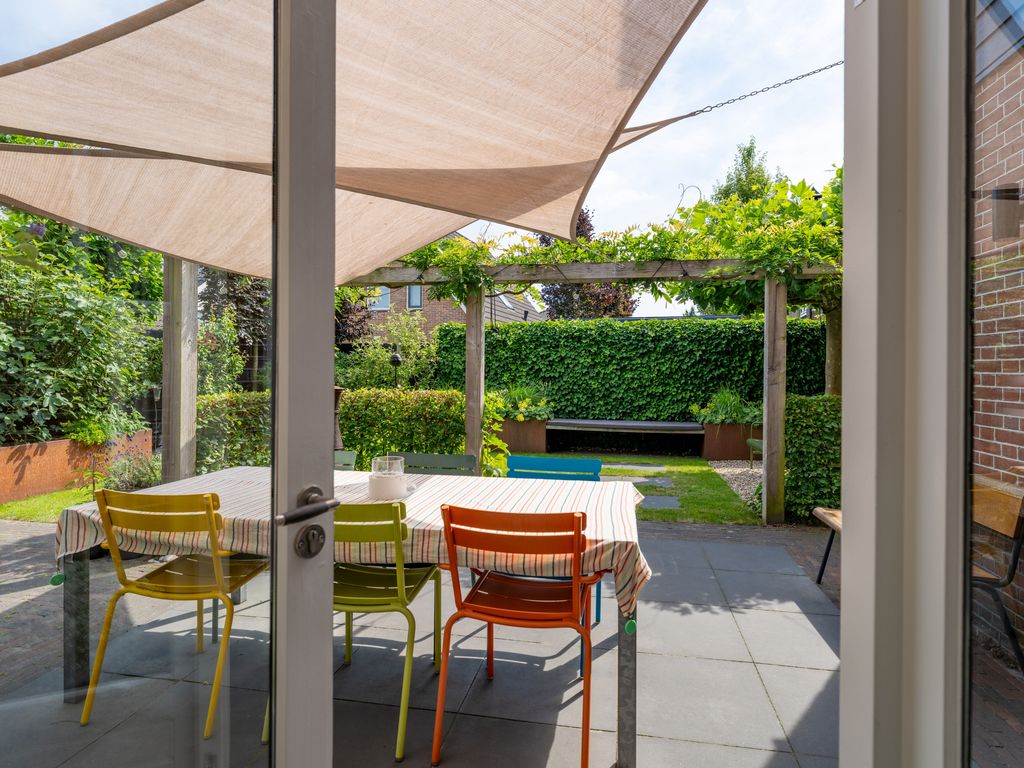 De ruime, onder architectuur aangelegde tuin op het zuiden biedt veel privacy en vormt een oase van rust. Cortenstaal  accenten, sfeervolle verlichting , automatische beregening en een sedum dak op de houtopslag zorgen voor een verzorgde, luxe uitstraling. De voortuin met karakteristiek toegangshek en hardstenen trap maakt het geheel compleet. De ruime oprit biedt plaats aan drie auto’s en op de grote schuur met zolder bevinden zich negen zonnepanelen. Al het houtwerk is recent geschilderd; zinken goten, luiken en regenwateropvangsystemen versterken de duurzame kwaliteit van dit huis.