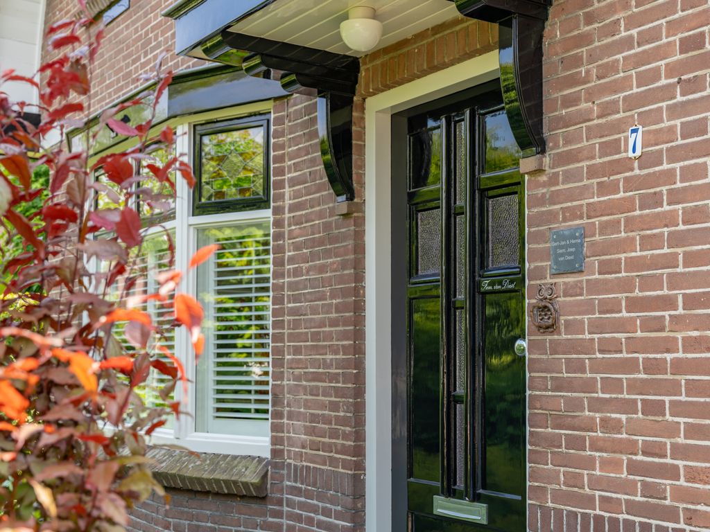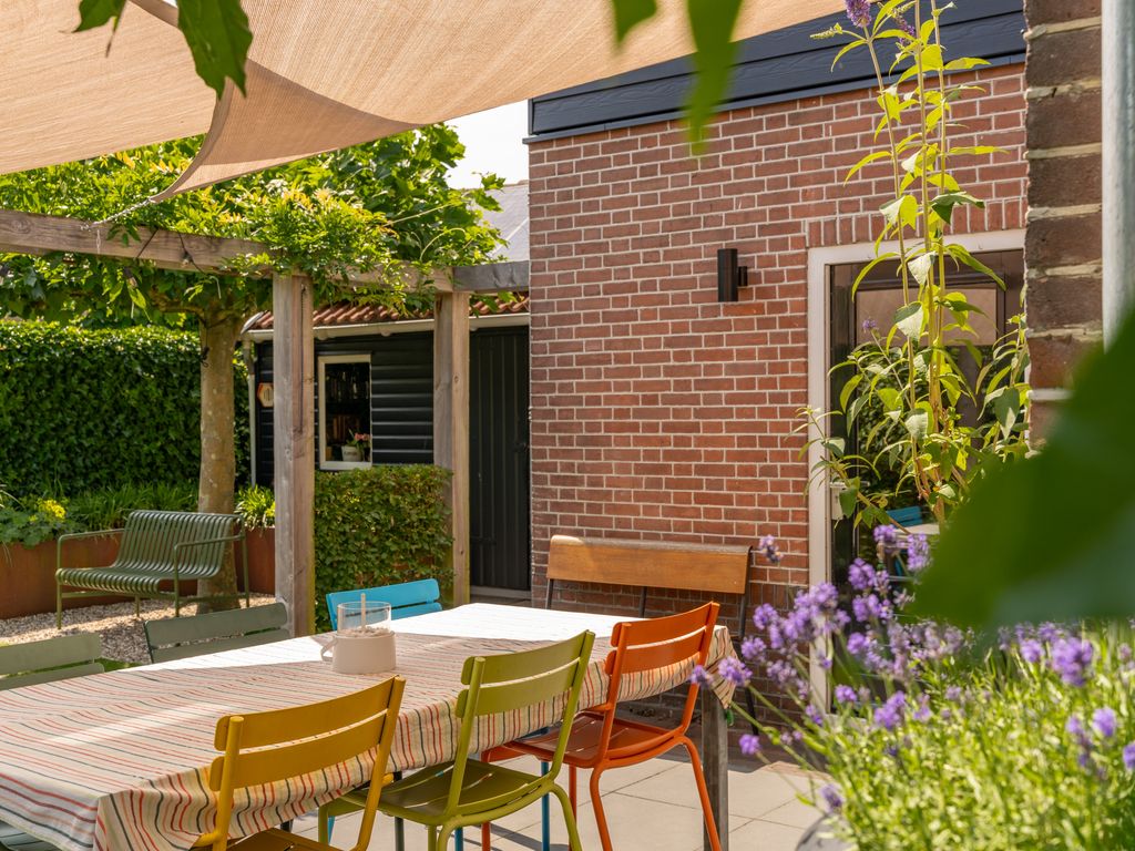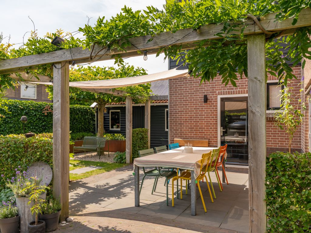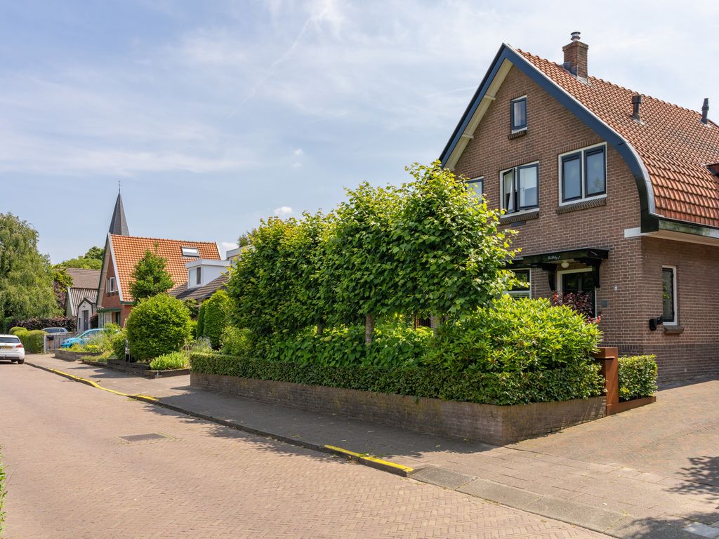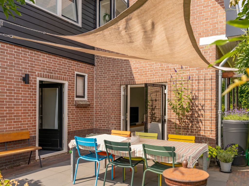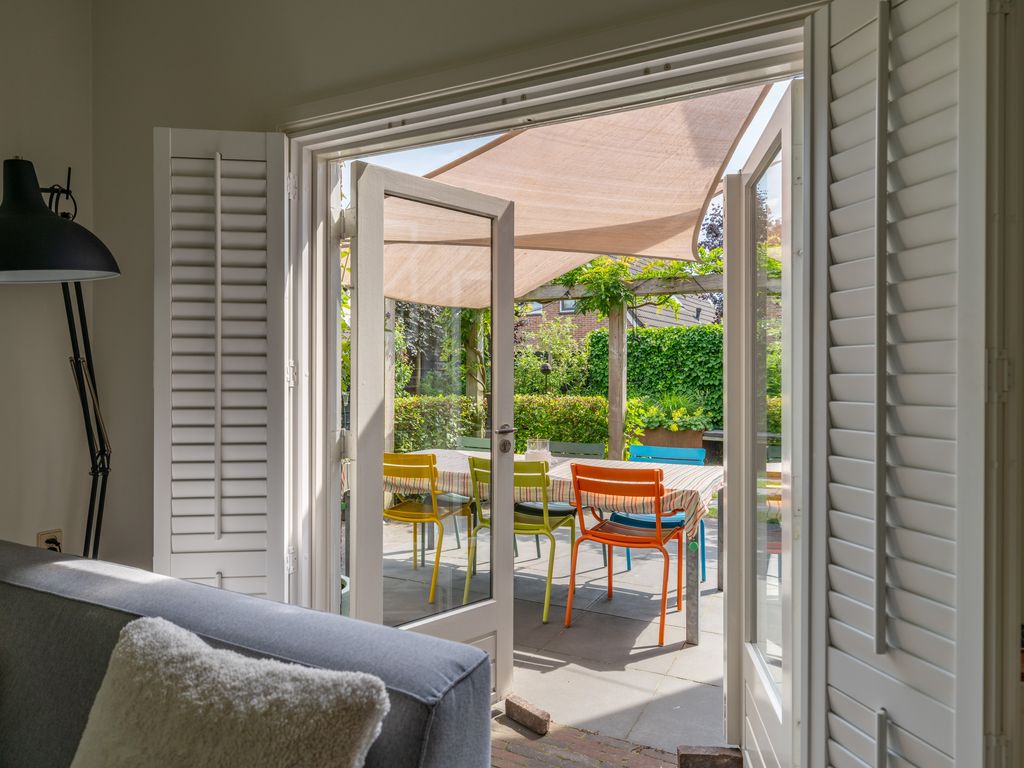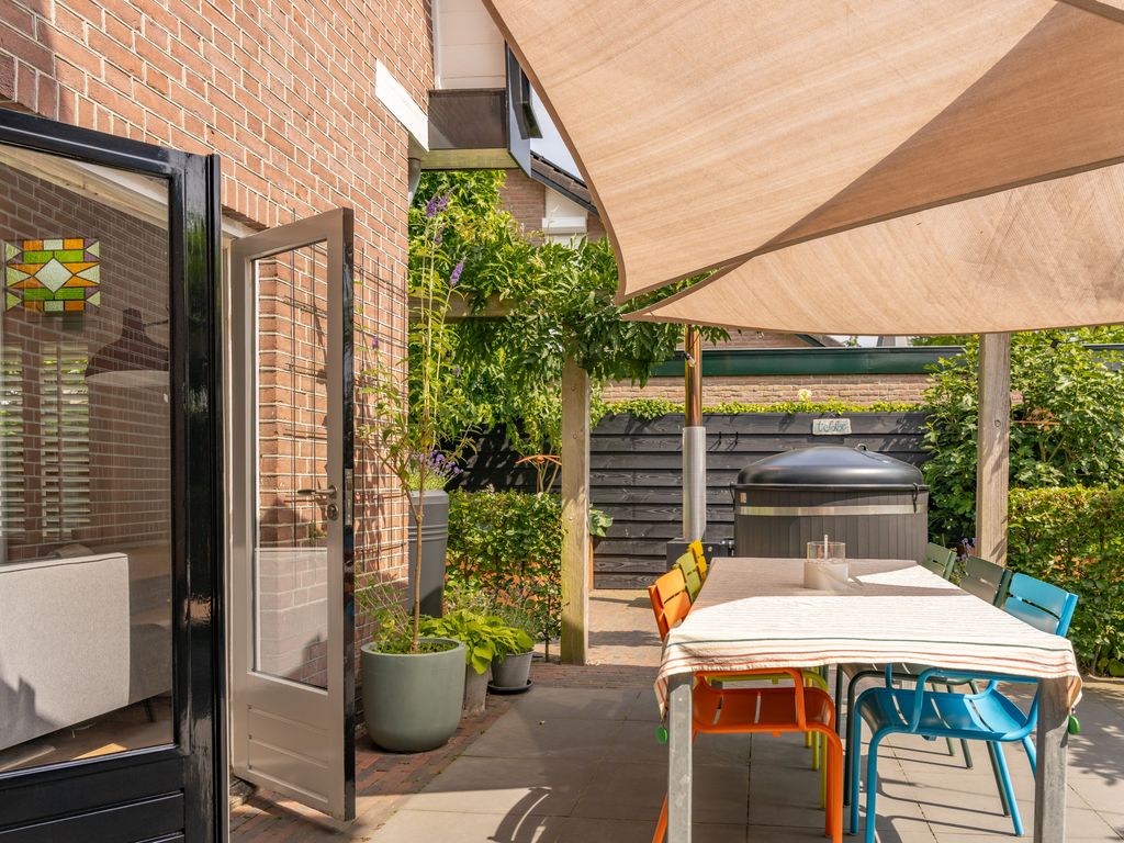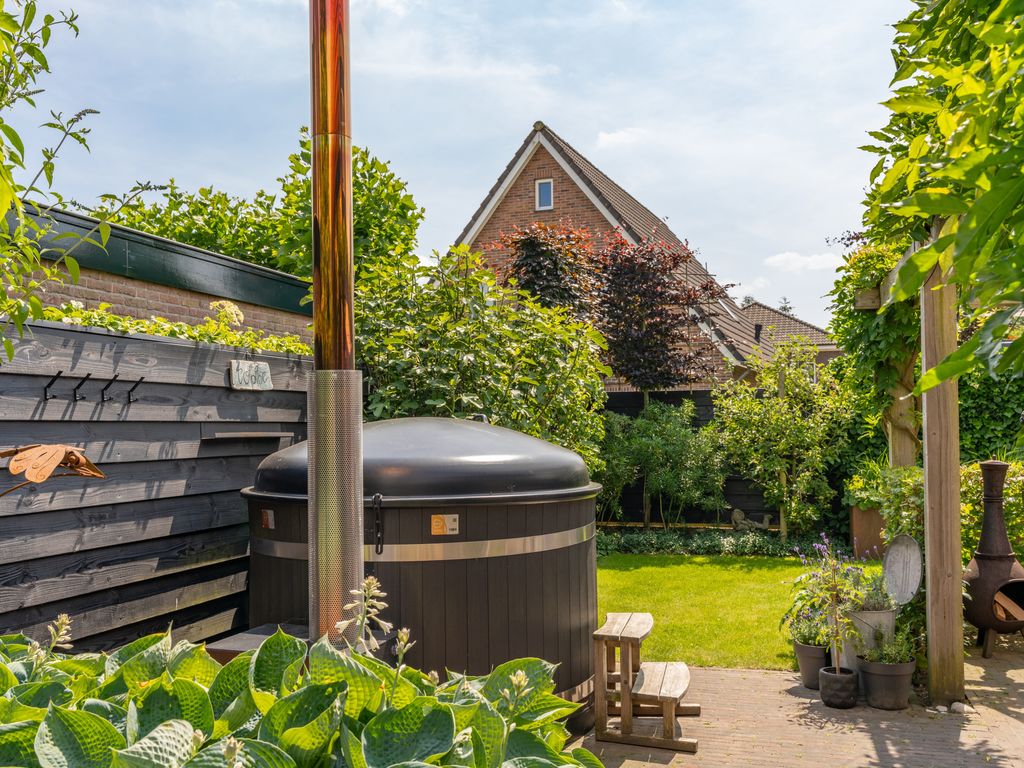 De ruime, onder architectuur aangelegde tuin op het zuiden biedt veel privacy en vormt een oase van rust. Cortenstaal  accenten, sfeervolle verlichting , automatische beregening en een sedum dak op de houtopslag zorgen voor een verzorgde, luxe uitstraling. De voortuin met karakteristiek toegangshek en hardstenen trap maakt het geheel compleet. De ruime oprit biedt plaats aan drie auto’s en op de grote schuur met zolder bevinden zich negen zonnepanelen. Al het houtwerk is recent geschilderd; zinken goten, luiken en regenwateropvangsystemen versterken de duurzame kwaliteit van dit huis.