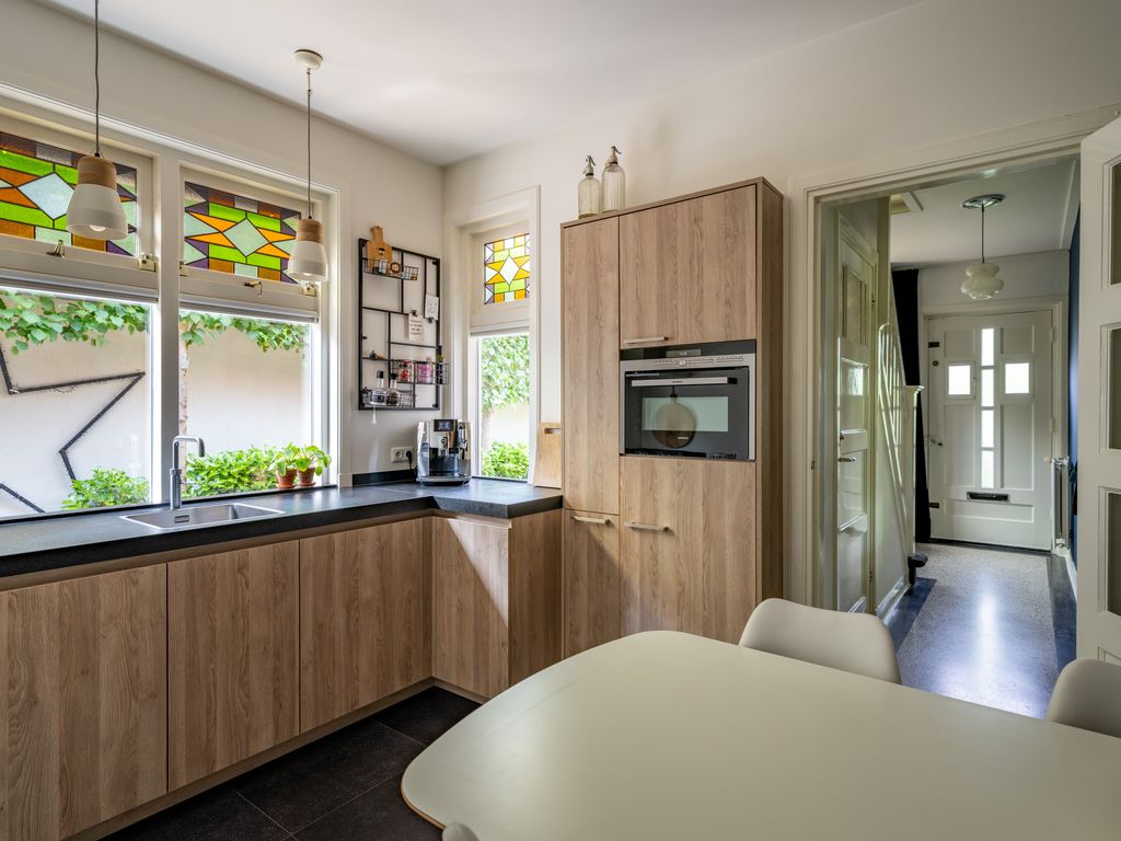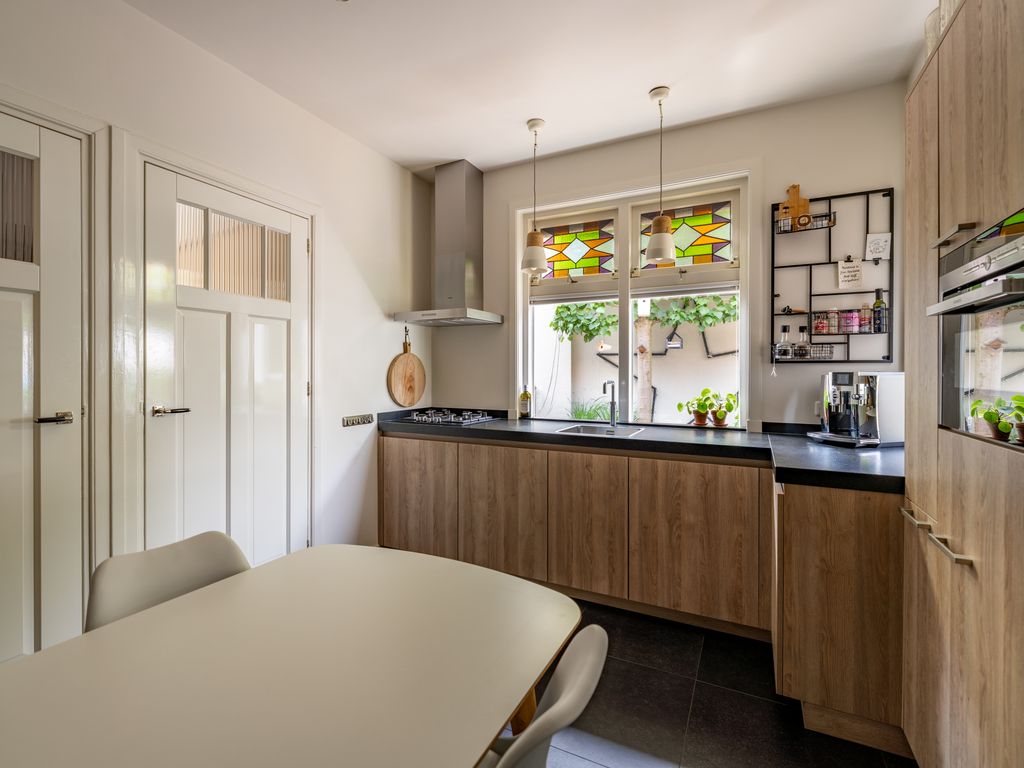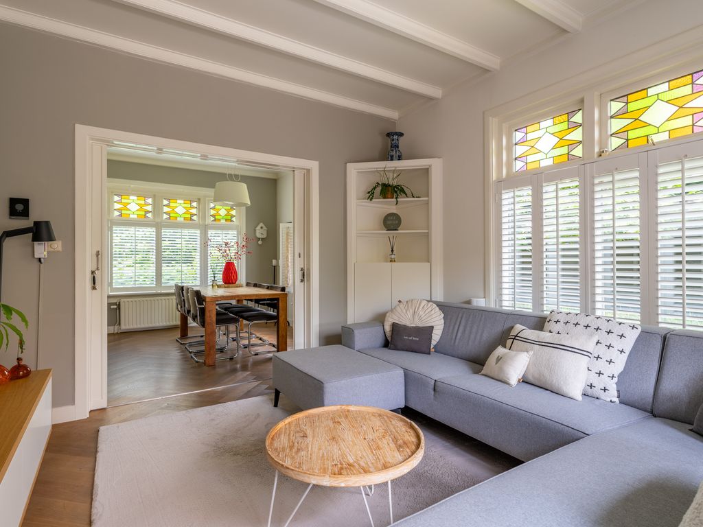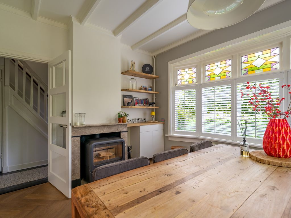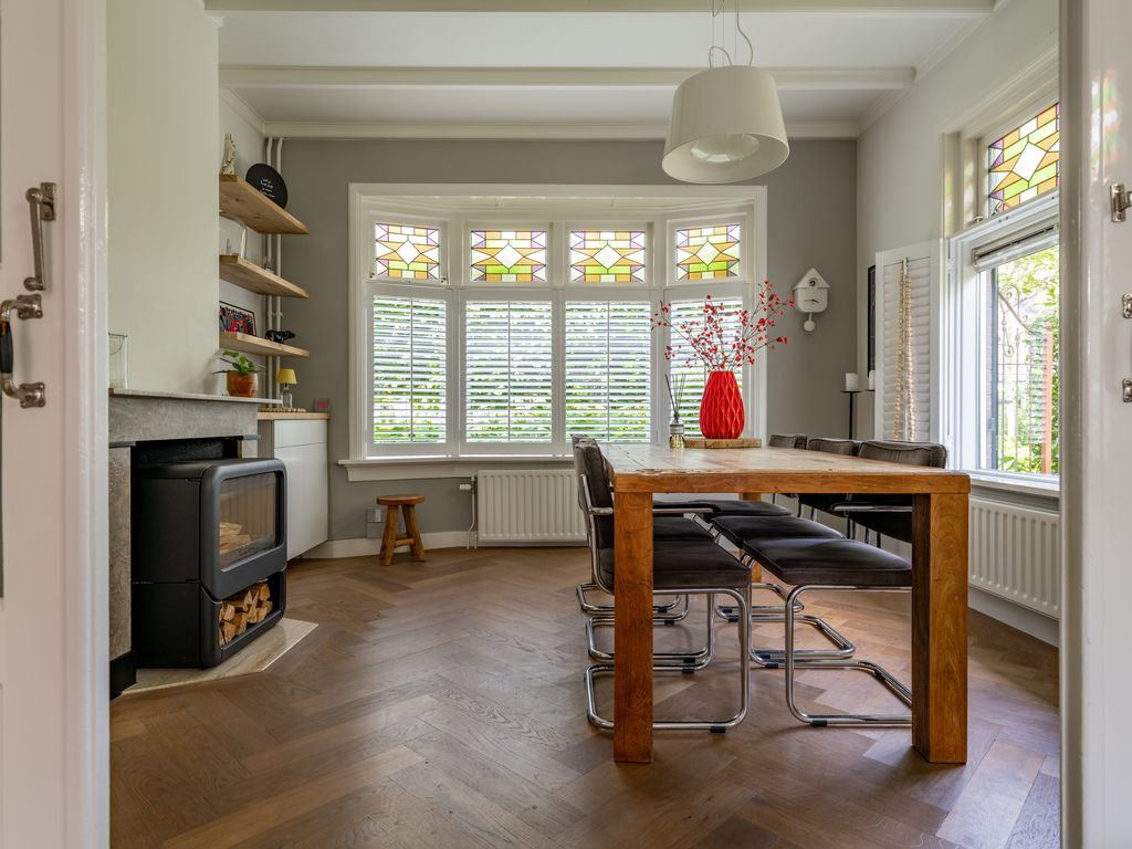 De lichte woonkamer met kamer-en-suite, marmeren schouw en houtkachel vormt het hart van de woning. Openslaande deuren leiden naar het zonovergoten terras – een heerlijke plek om te ontspannen. De authentieke jaren ’30 details – glas-in-loodramen, paneeldeuren, erker, granieten vloer – zijn zorgvuldig bewaard gebleven en combineren prachtig met  modern wooncomfort. De keuken met karakteristieke erker en schouw is zowel stijlvol als functioneel, voorzien van hoogwaardige apparatuur waaronder een Quooker. De keuken geeft toegang tot een royale (wijn)kelder met daglicht. De praktische bijkeuken heeft een nieuwe kastenwand.