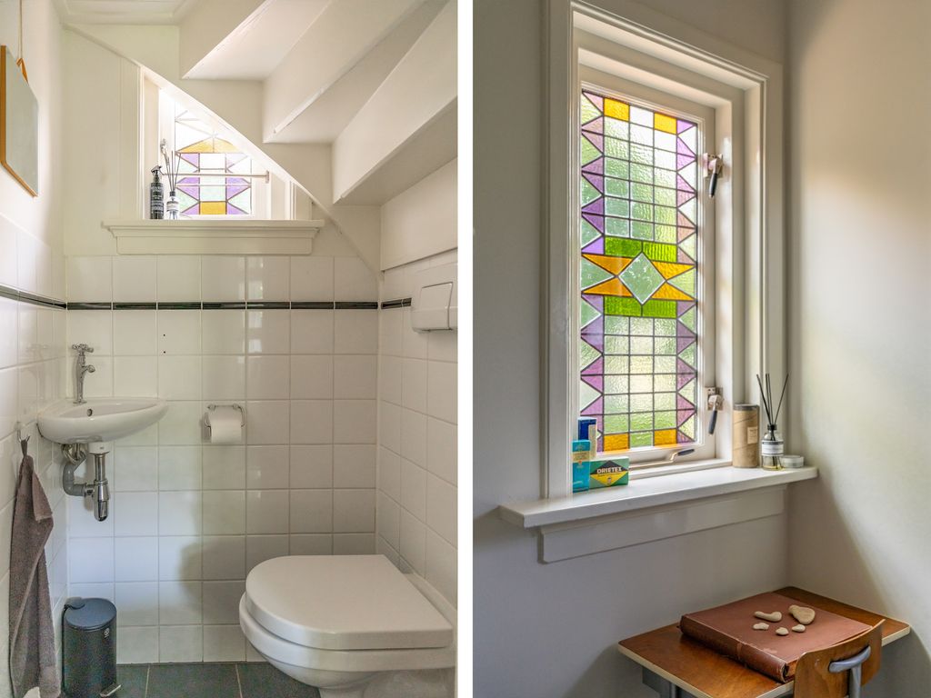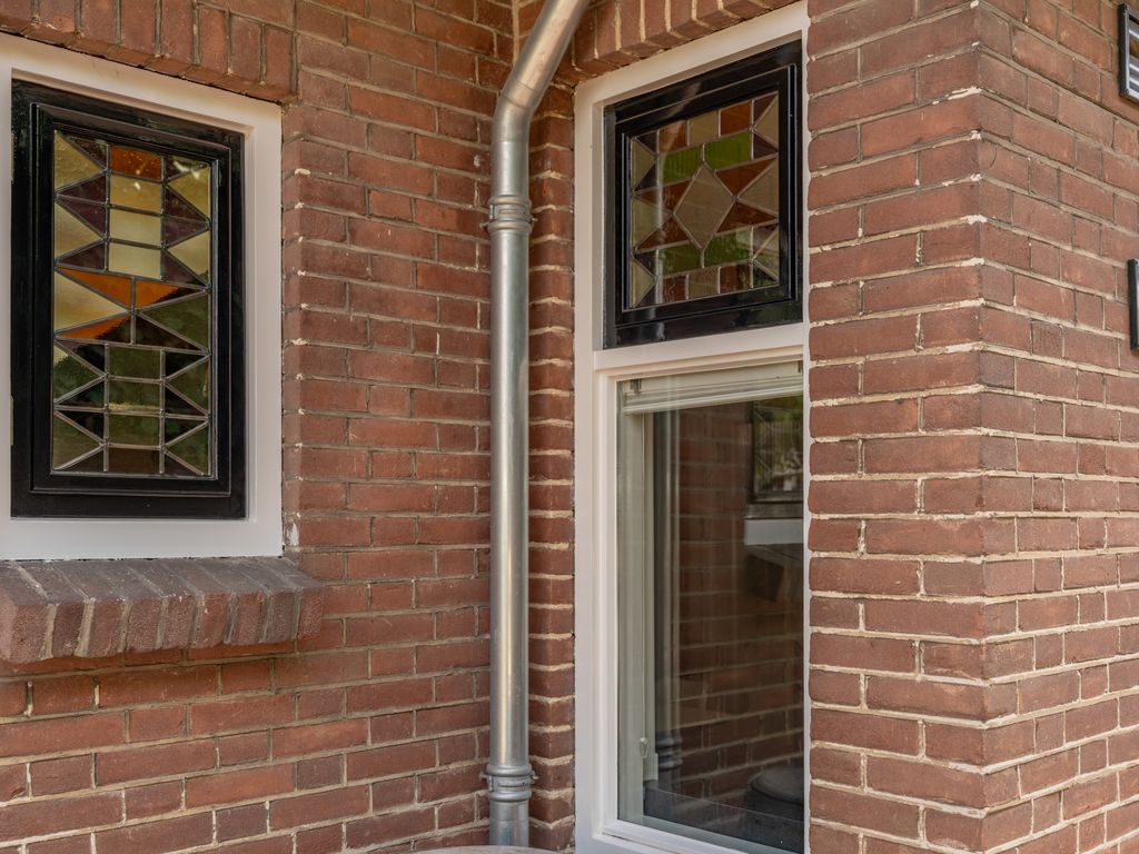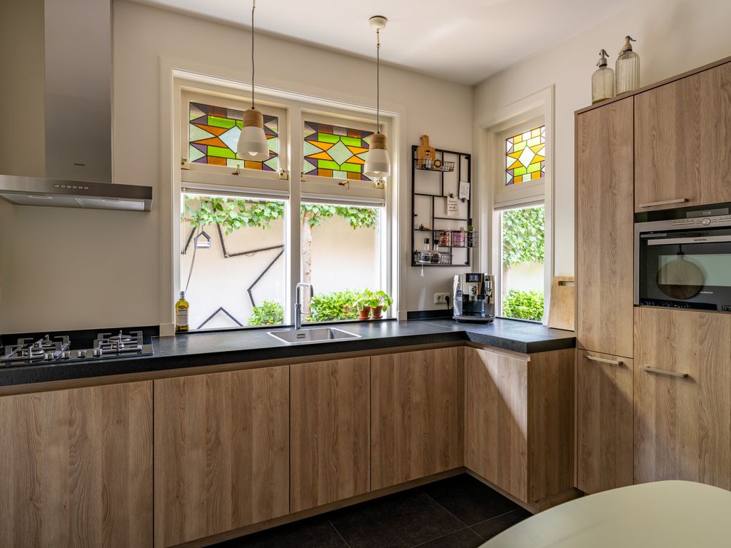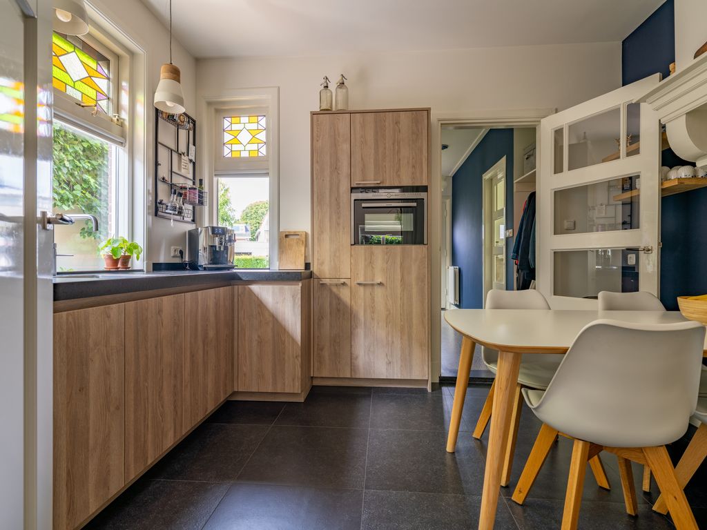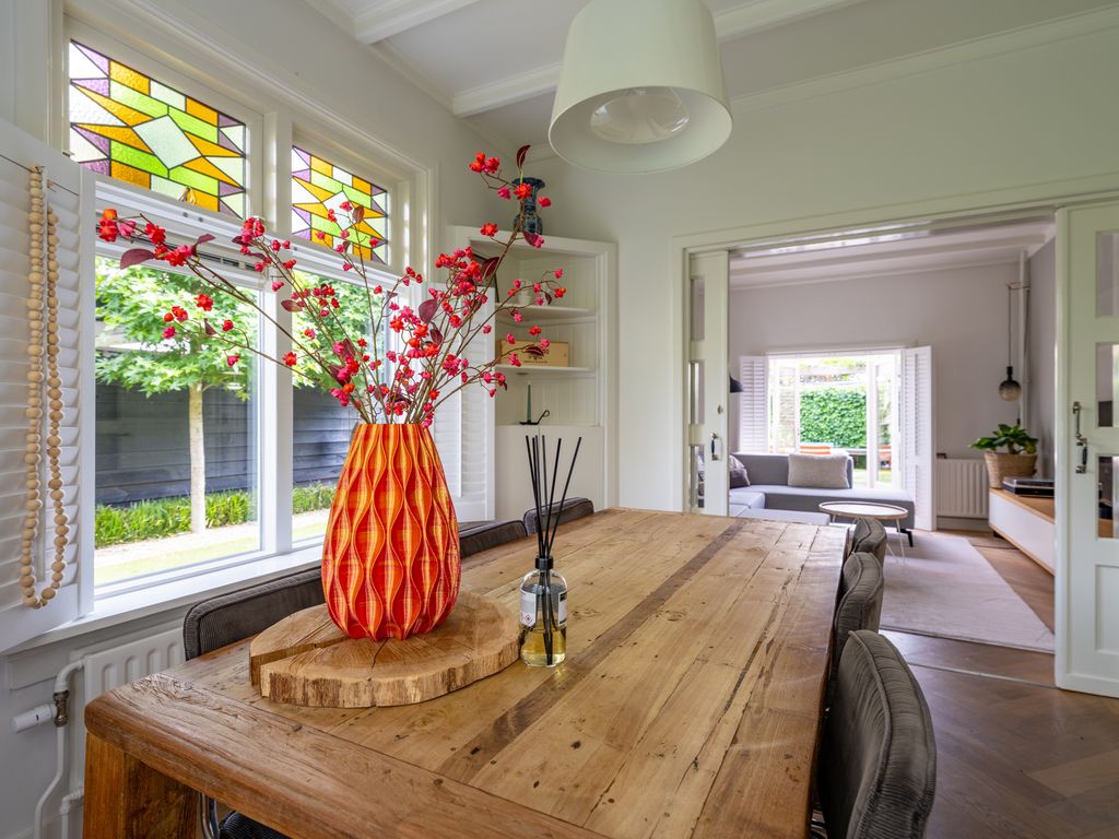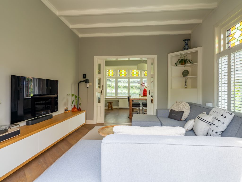 De lichte woonkamer met kamer-en-suite, marmeren schouw en houtkachel vormt het hart van de woning. Openslaande deuren leiden naar het zonovergoten terras – een heerlijke plek om te ontspannen. De authentieke jaren ’30 details – glas-in-loodramen, paneeldeuren, erker, granieten vloer – zijn zorgvuldig bewaard gebleven en combineren prachtig met  modern wooncomfort. De keuken met karakteristieke erker en schouw is zowel stijlvol als functioneel, voorzien van hoogwaardige apparatuur waaronder een Quooker. De keuken geeft toegang tot een royale (wijn)kelder met daglicht. De praktische bijkeuken heeft een nieuwe kastenwand.
