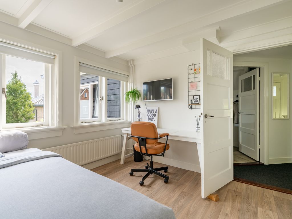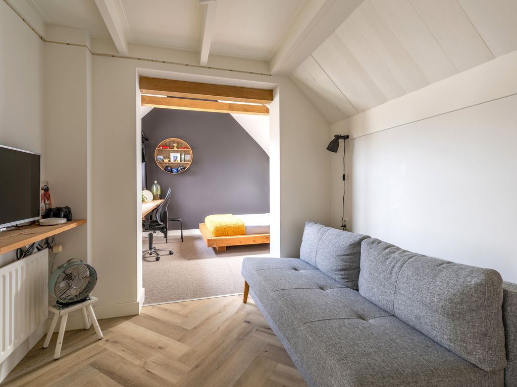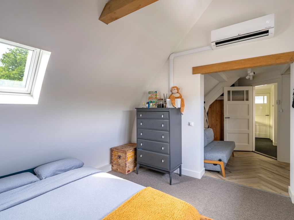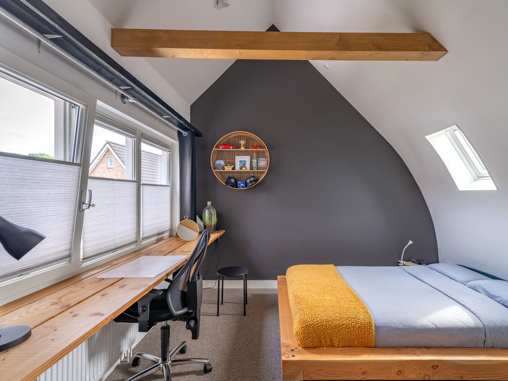 De eerste verdieping biedt drie ruime slaapkamers, elk met inbouwkasten en prachtige lichtinval. Eén kamer is voorzien van airconditioning (koelen én verwarmen), en de slaapkamer aan de achterzijde heeft isolerende zonwering op zonne-energie. De badkamer is in 2024 volledig vernieuwd en uitgevoerd met vloerverwarming, een stortdouche en tweede toilet – stijlvol, modern en comfortabel. Een vaste trap leidt naar de tweede verdieping onder het karakteristieke ronde dak, waar zich een sfeervolle, geïsoleerde ruimte bevindt. Ideaal als werkplek, logeer- of hobbykamer.
