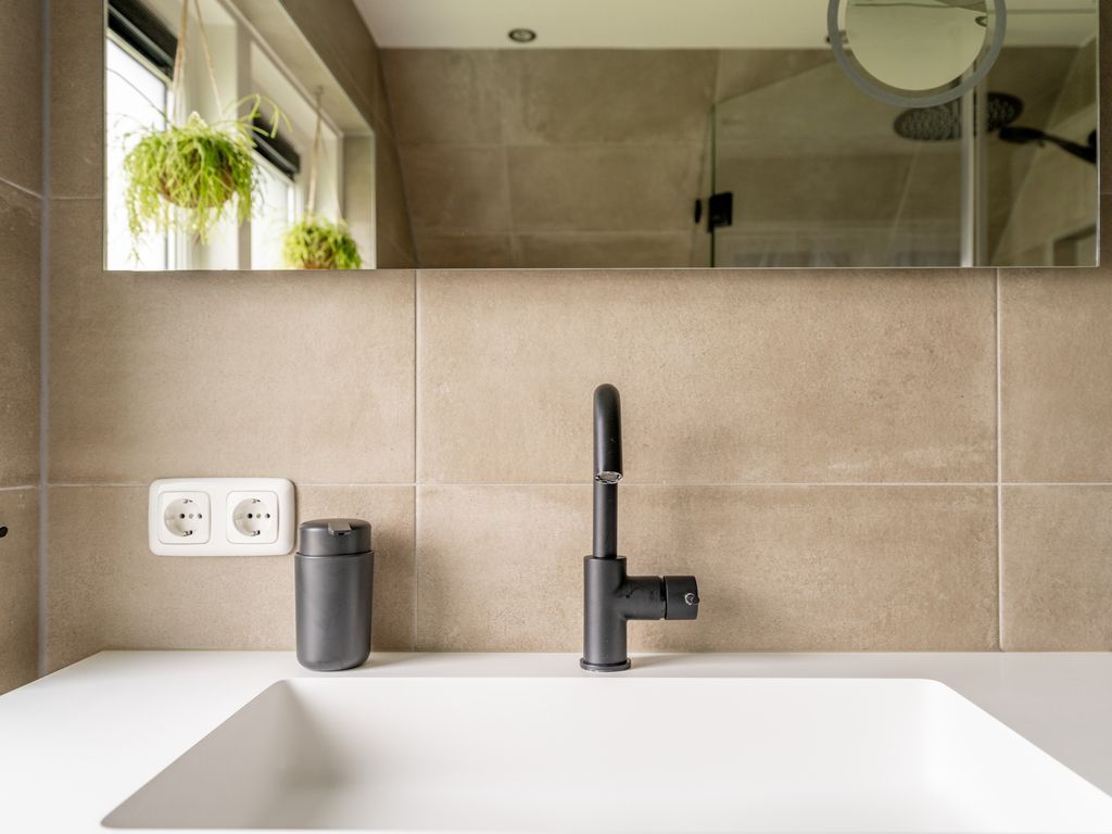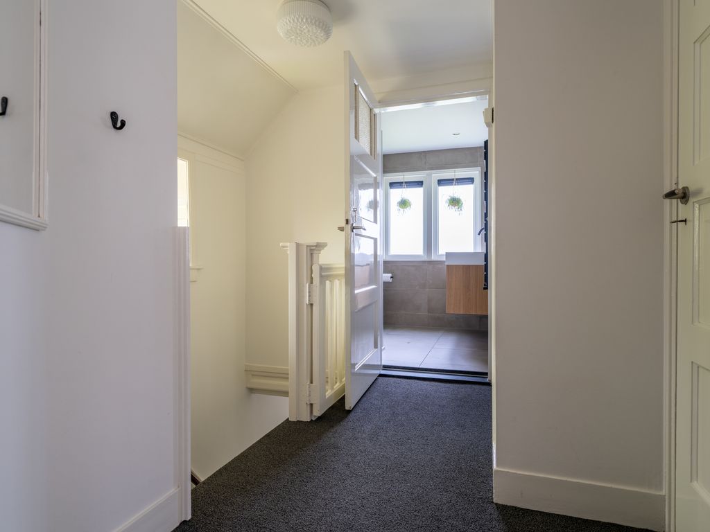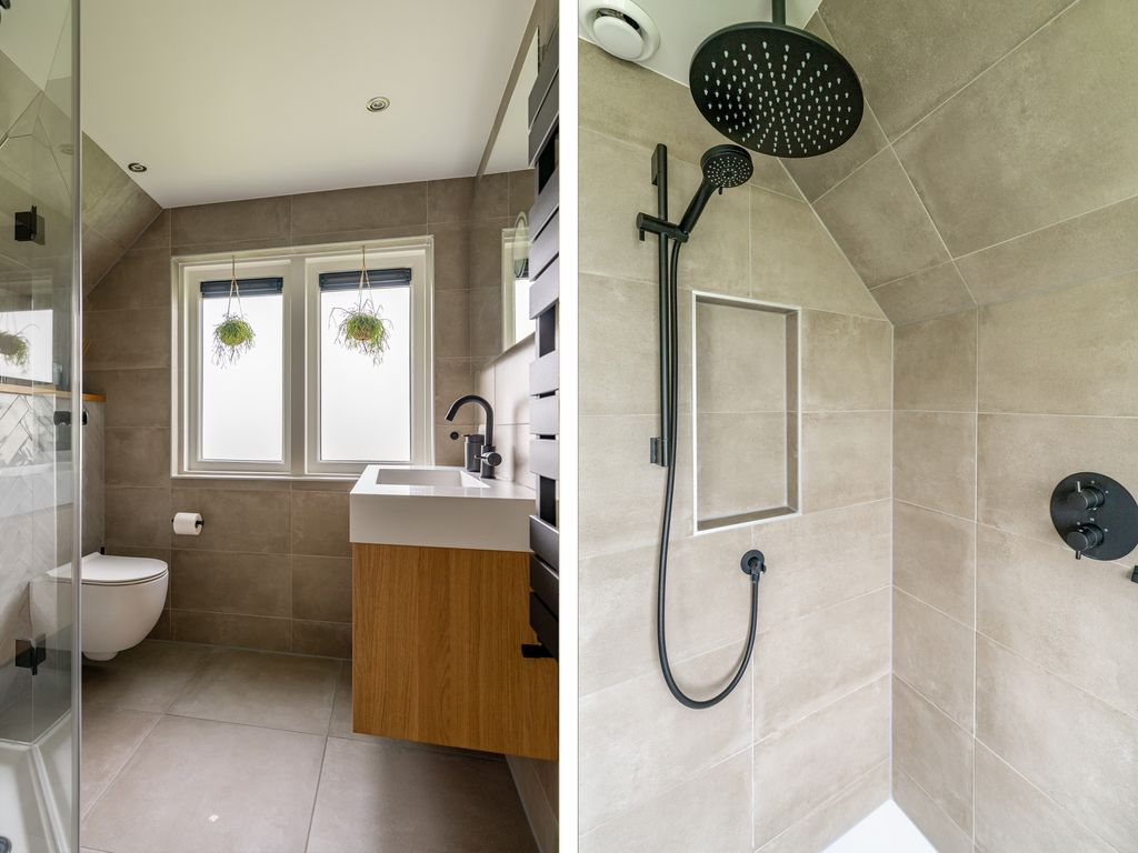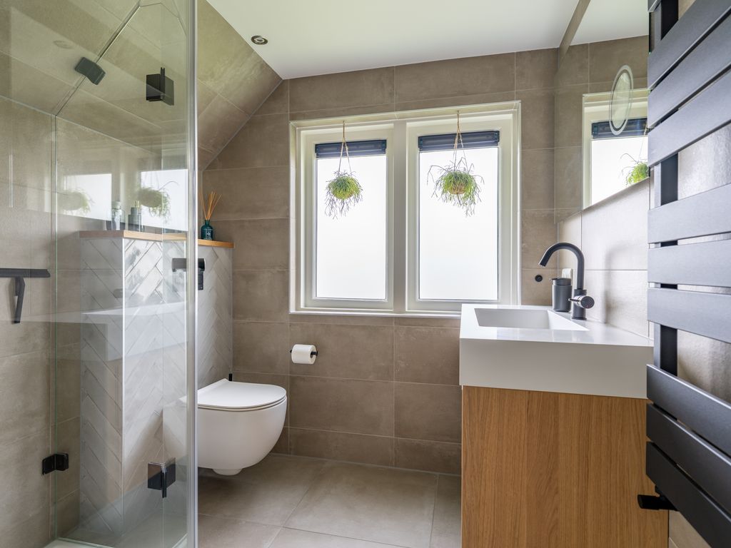 Overloop, modern betegelde badkamer (2024) voorzien van douchecabine, wastafelmeubel, tweede toilet en design radiator, ruime ouderslaapkamer met een vaste kast aan de voorzijde, slaapkamer met vaste kast aan de achterzijde, tussenhal met bergruimte en toegang tot de nieuw gerealiseerde slaapkamer met airco.