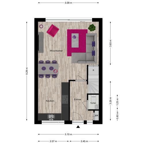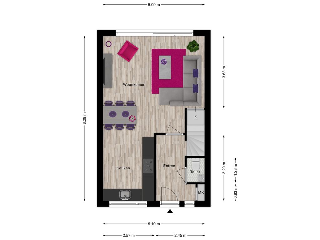 hal met toilet. Lichte woonkamer met trapkast en schuifpui naar de achtertuin. De nette open keuken is aan de voorzijde gelegen.
