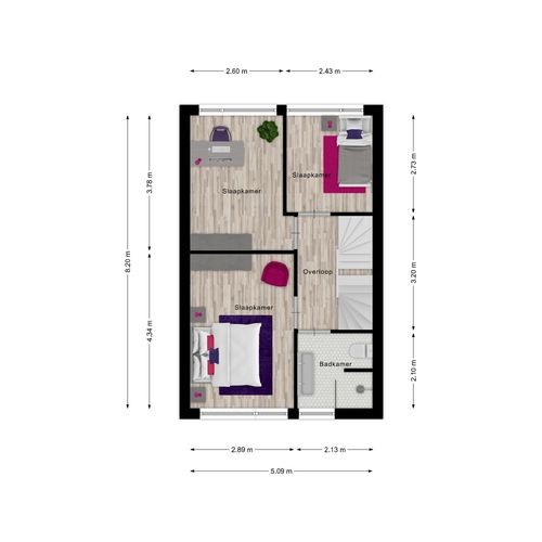 overloop, 3 slaapkamers en een vernieuwde badkamer voorzien van inloopdouche, dubbele wastafel in meubel en 2e toilet.